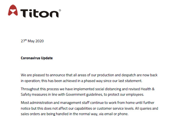 We are pleased to announce that all areas of our production and despatch are now back in operation;…