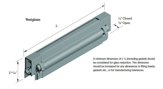 A minimum dimension of 2-1/8″ (including gasket) should be considered for glass reduction. This dimension should be increased for any allowances in fitting beads, gaskets etc, or for manufacturing tolerances.